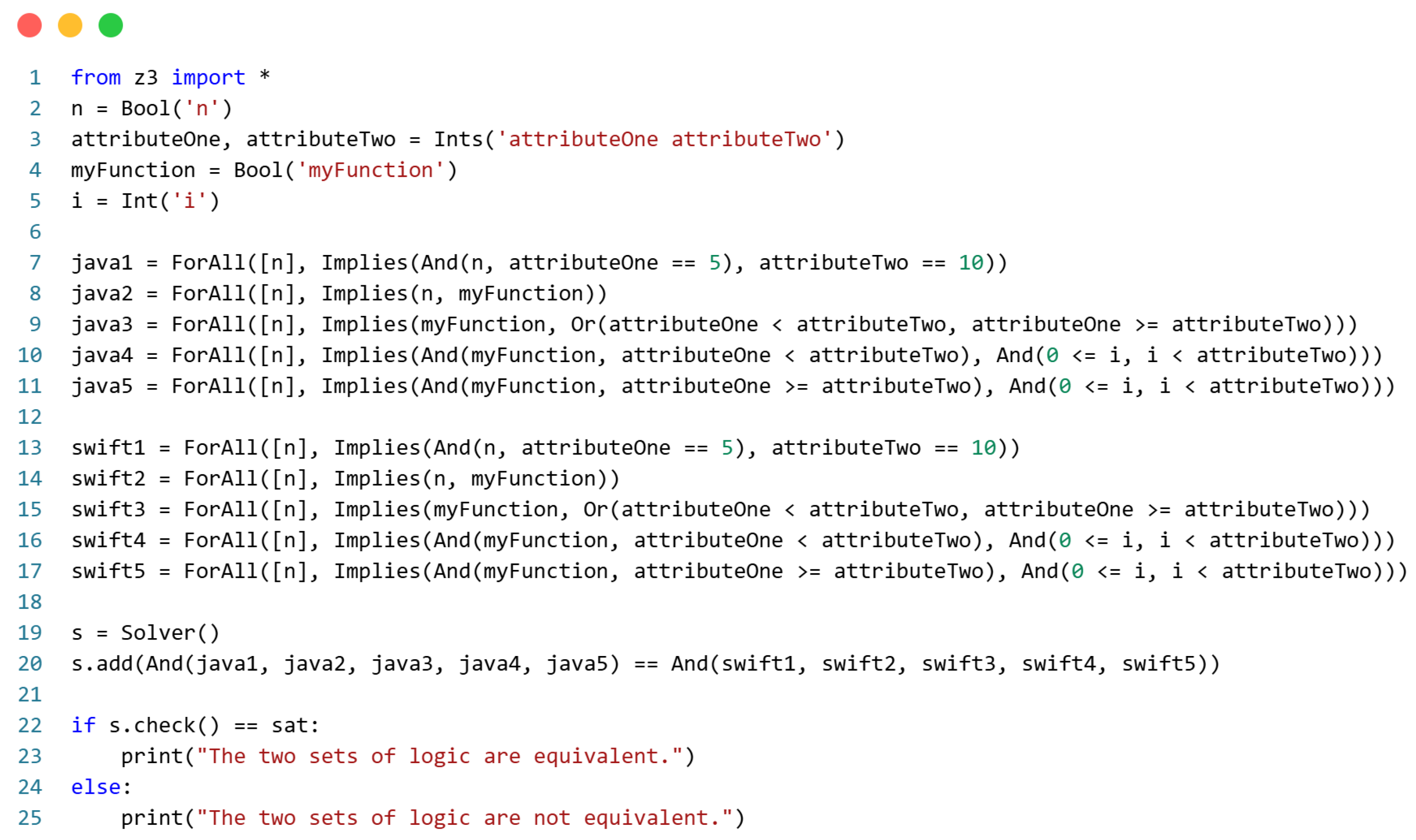 - No Direct Link to Programming Languages: Although Z3 can check for satisfiability, it cannot parse or interpret Swift or Java syntax. All language constructs must be expressed manually in FOL, preventing the automatic extraction of semantics and hindering the scalability of this approach.