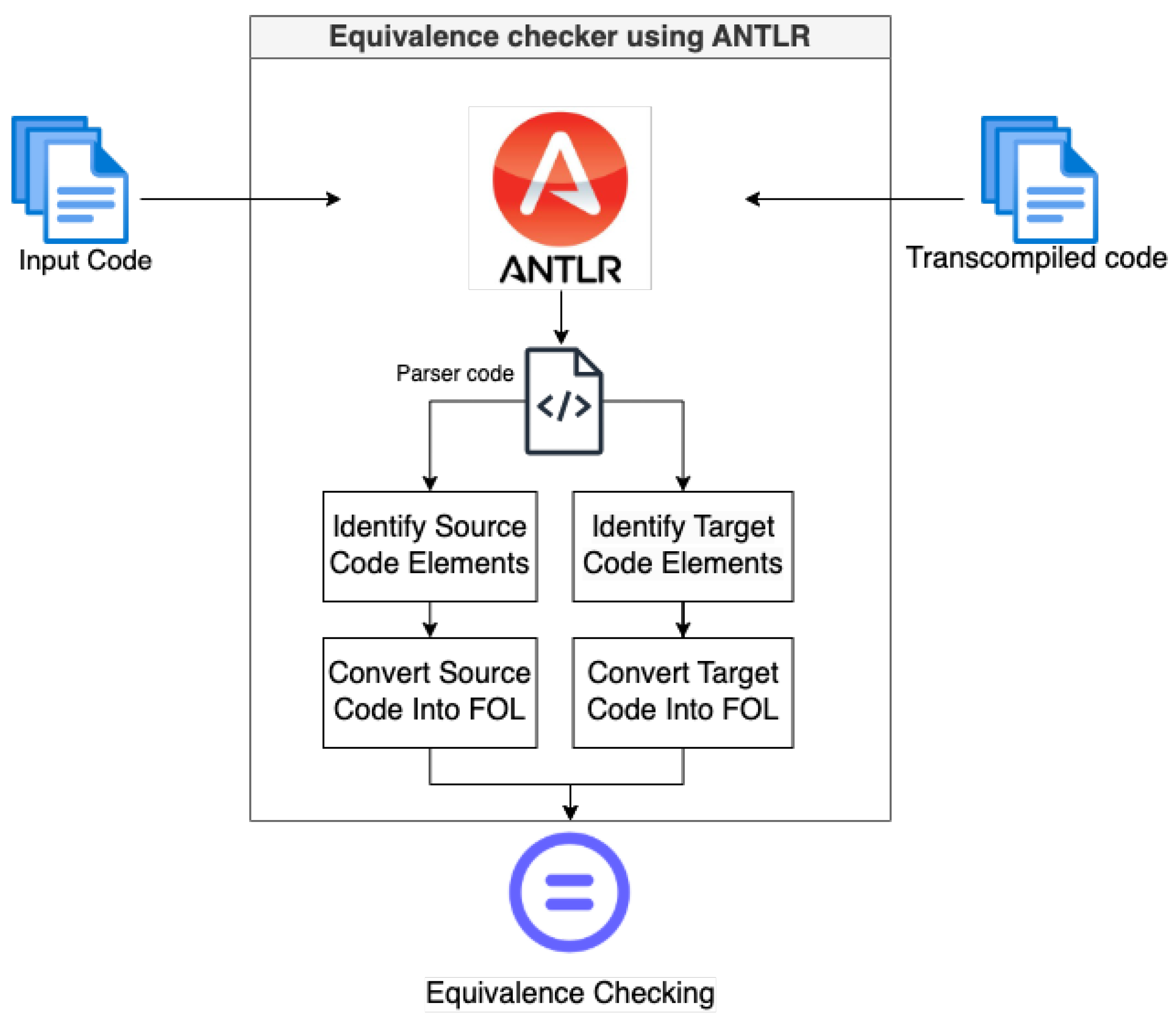 - ANTLR: Used for parsing the source and target codes and generating structured syntax trees for equivalence checking.