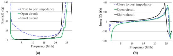 Figure A2 shows the real part of the impedance () of the open structure obtained from simulation, measurement, and the proposed electrical model in this article. The agreement between simulation and measurement validates the method. The high capacitive effect of the structure at low frequencies is attributed to the high permittivity of the substrate, which is necessary to achieve the required pitch for the measurement probes, as well as to the large size of the structure.