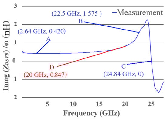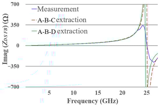 The extracted parameters are presented in Table 1. The imaginary part of the impedance, obtained from measurements at DSFB, along with the electrical model from Figure 6b using the values obtained from both parameter extractions (A-B-C and A-B-D), is shown in Figure 9.