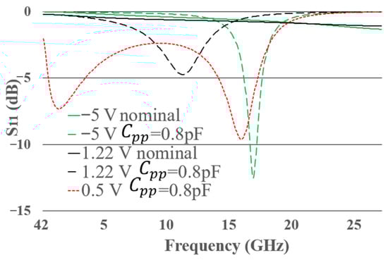 As expected, the −5 V and 1.22 V nominal plots remain close to 0 dB, since they represent an open circuit and a short circuit, respectively. In the plots for −5 V, −0.5 V, and 1.22 V with = 0.8 pF, a matching point appears at 16.8, 15.88, and 11.1 GHz. The frequency shift of these matchings is due to the combined effects of the diode’s intrinsic part and the packaging. Since the matchings appear across all bias points, the diode is not rectifying but instead acting as a partially matched load to the port, which is an undesired behavior. In the diode packaging, changes in inductance can be associated with the size of the pads and internal interconnections, while changes in capacitance may result from variations in the size and spacing of the contact pads.