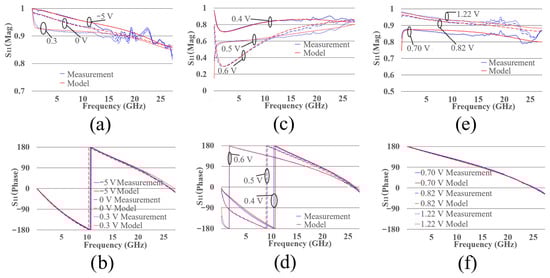 The S11 for the three operating regions of the unpackaged diode, obtained from both the model and measurements, are presented in Figure 11. Figure 11a corresponds to the bias values ranging from −5 V to 0.3 V, Figure 11b corresponds to the bias values between 0.4 V and 0.6 V and Figure 11c corresponds to the bias values from 0.7 V to 1.22 V. Good agreement between the measured data and the model is observed.