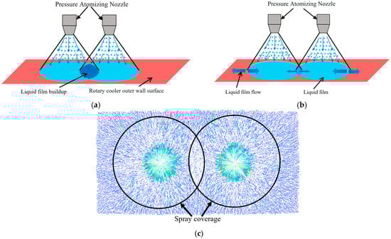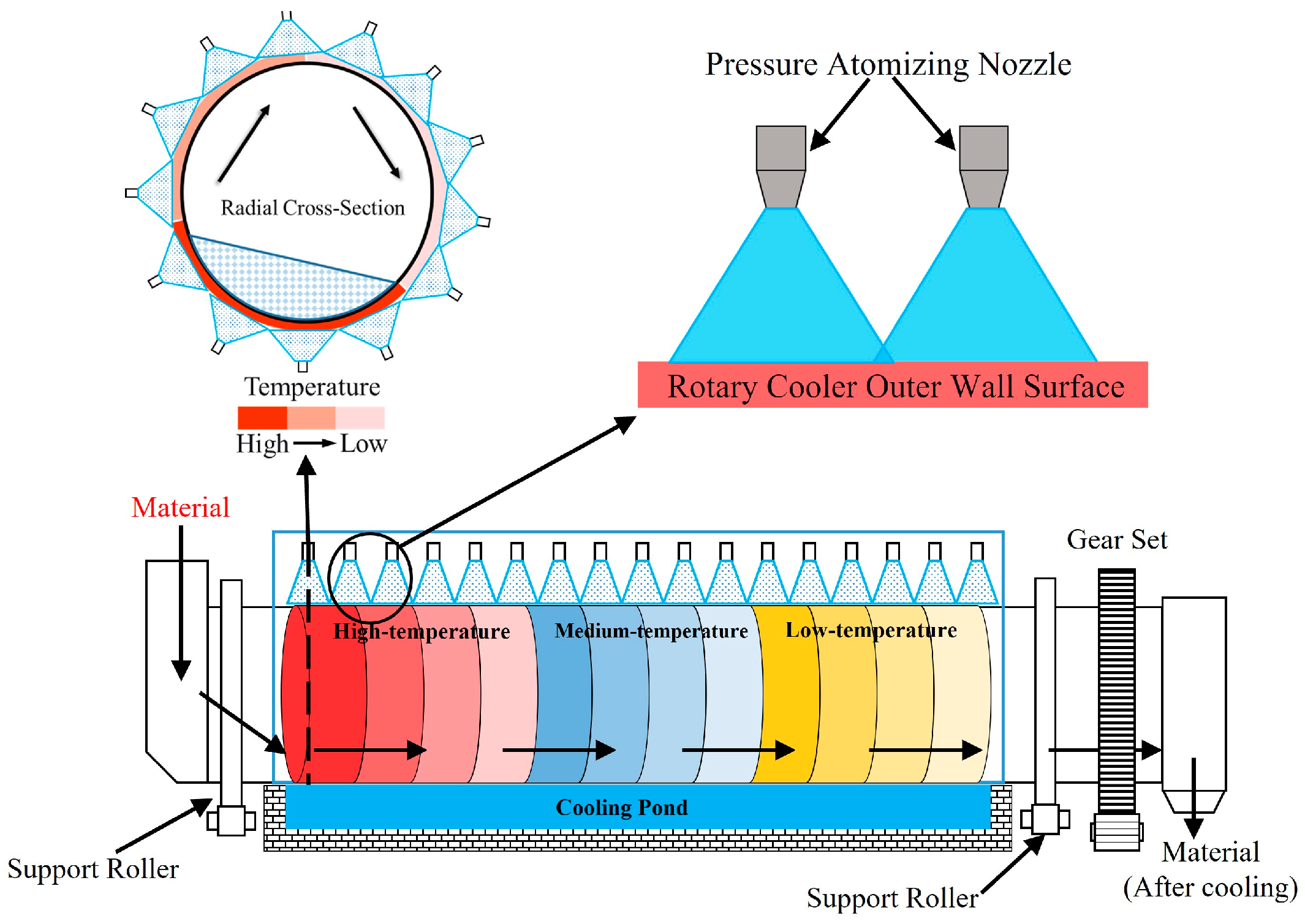 25]. Consequently, oxygen-free cooling has been identified as a critical process in low-carbon cement production, necessitating indirect cooling methods. In the past, industrial-scale high-temperature material cooling has been predominantly achieved through air cooling or immersion methods. Air cooling is characterized by low efficiency in both radiative and convective heat transfer. Immersion cooling submerges the rotary kiln cylinder in water. However, this method primarily relies on convective heat transfer between the outer wall and water, exhibiting lower efficiency compared to evaporative heat transfer. Therefore, a rapid cooling strategy incorporating spray cooling for industrial rotary coolers is proposed and numerically simulated in this study. This approach provides a viable optimized solution and theoretical foundation for efficient, rapid cooling of low-carbon cement. The investigated industrial rotary cooler features an inlet high-temperature zone of 800 °C. By optimizing the spray cooling parameters, a balance is achieved between temperature uniformity and increased effective heat transfer area, while maintaining a high heat flux. Furthermore, ensuring temperature uniformity thereby prevents localized overheating on the high-temperature external surface of the cylinder.
