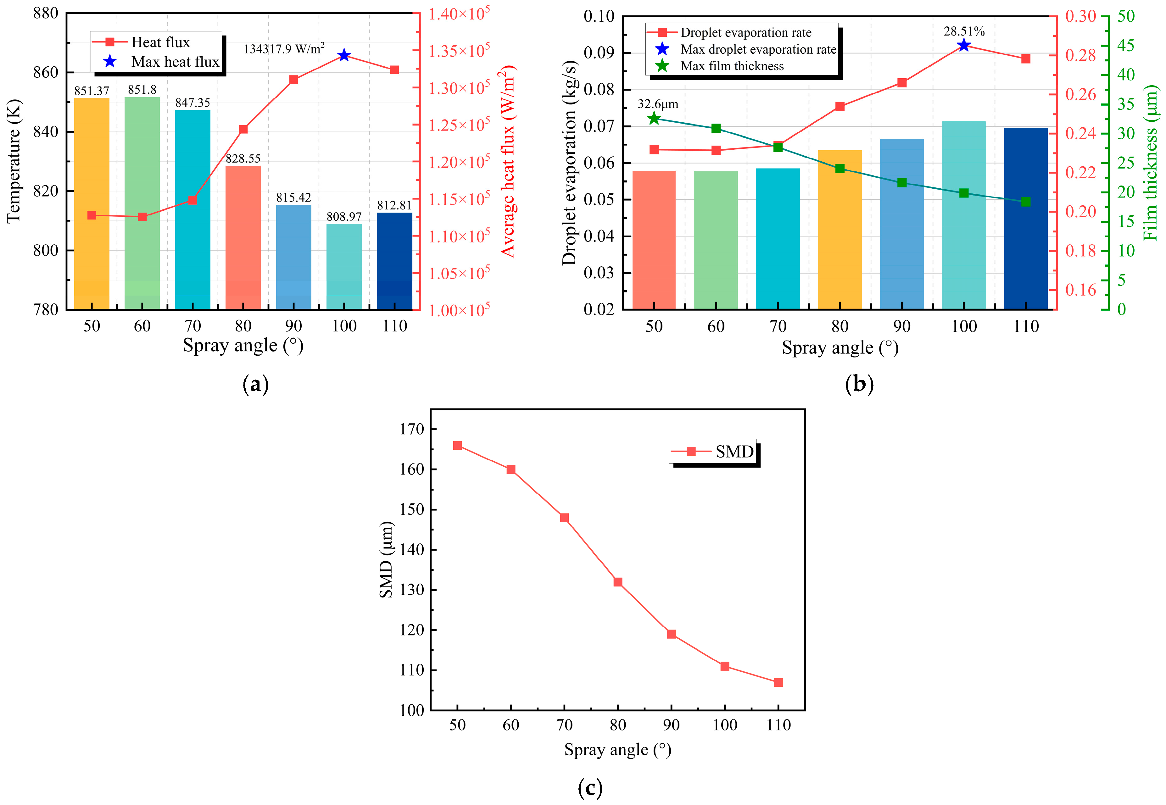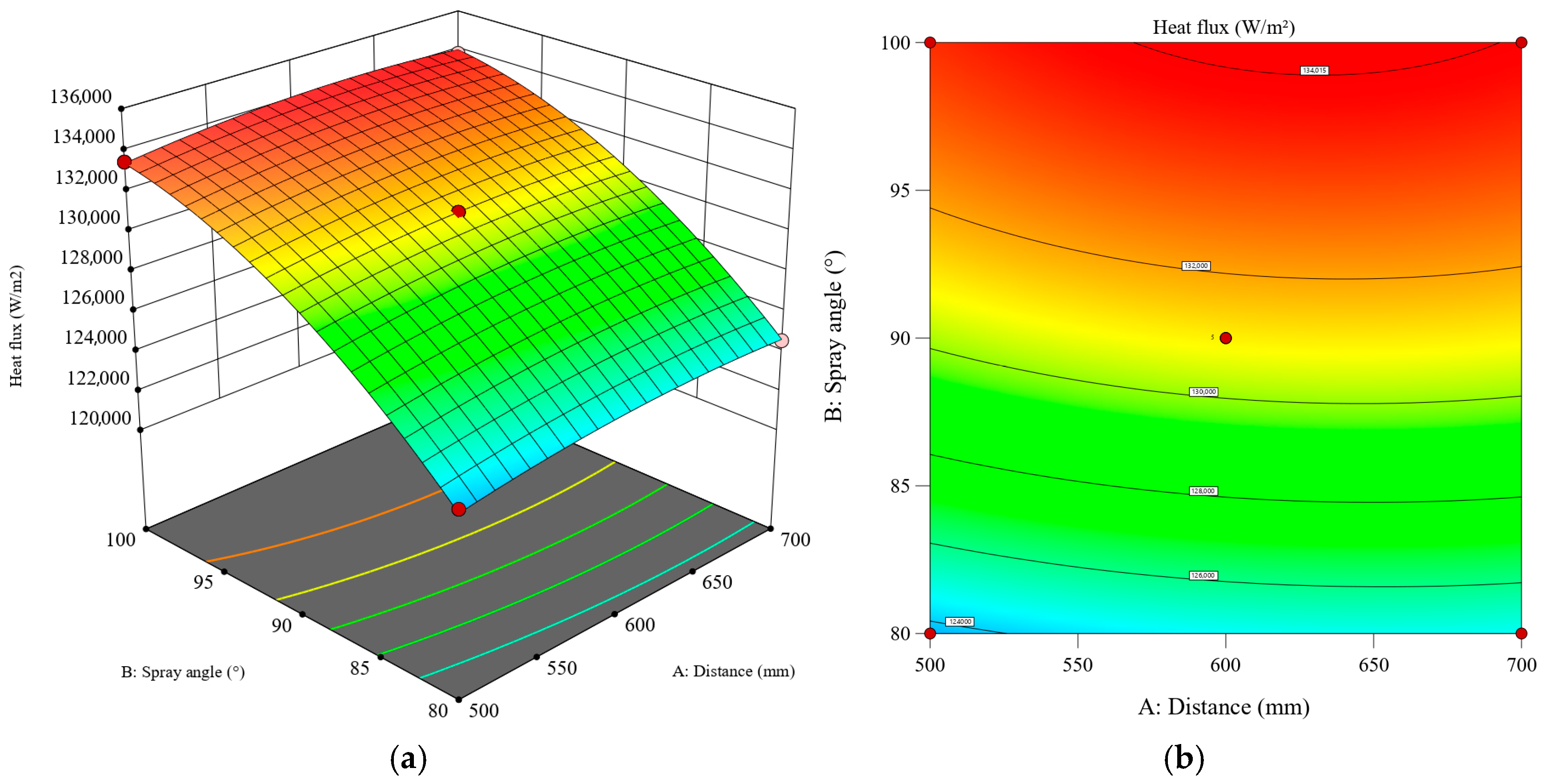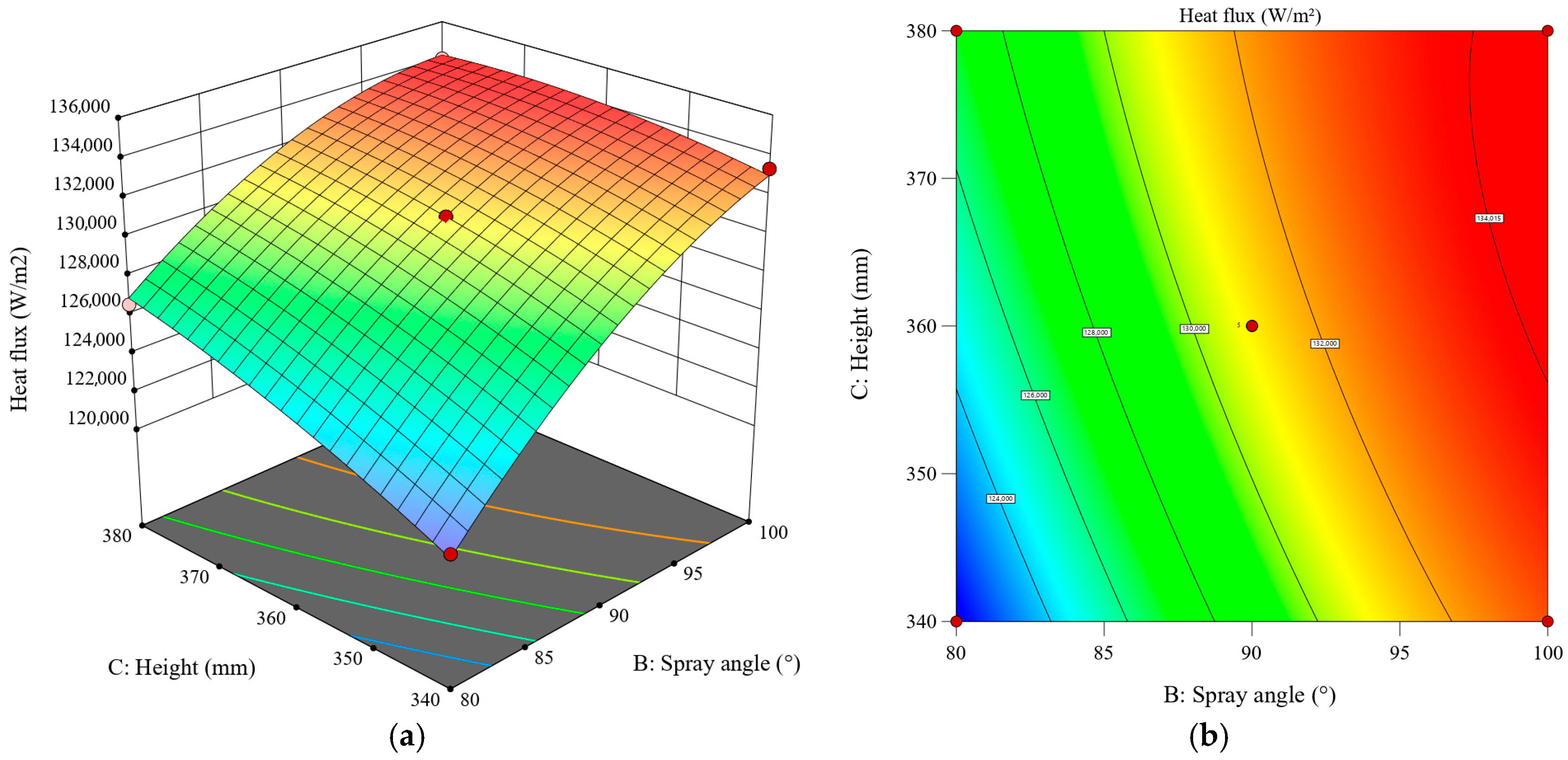 26]. Numerical simulations were employed to examine the effects of spray angle, nozzle distance, spray height, and cooling water mass flow rate on the cooling efficiency. The influence of spray parameters on heat transfer performance is demonstrated through cooling surface heat flux and liquid film thickness. Response surface methodology (RSM) was used to evaluate the effects of key spray parameters and reveal their synergistic enhancement effects. Furthermore, multi-objective optimization design (MOD) based on RSM was conducted, yielding an optimal combination of spray parameters.