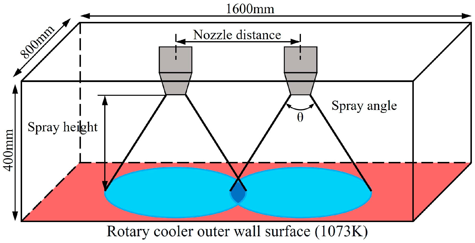 Previous research has primarily been conducted on small-scale experimental platforms and tends to favor smaller spray angles to achieve higher local cooling intensity. However, for industrial-scale applications involving large surfaces, a balance must be struck between cooling performance and spray coverage area. Although small spray angles can achieve high cooling efficiency in localized regions, their application to large-scale industrial processes with extensive surfaces would require substantial amounts of water. Therefore, a strategy solely focused on high local cooling efficiency is not suitable for the continuous production engineering of large-scale cooling materials. In contrast, spray cooling with a large spray angle can provide greater coverage area, thereby improving water utilization efficiency while maintaining good cooling performance. In particular, research on industrially scaled large-spray-angle nozzle arrays remains limited for applications such as metallurgical production lines and cement clinker cooling. The kiln shell of a low-carbon cement rotary cooler is generally over 20 m, providing the engineering conditions necessary for installing a cooling section.