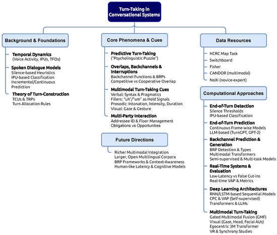 While humans navigate transitions in conversations almost effortlessly, many current conversational systems still struggle to handle smooth turn-taking. Common issues include poorly timed responses, such as delayed acknowledgments or premature interruptions, as well as failures to recognise when a speaker’s turn begins. These problems can result in overlaps or unfilled pauses, which can frustrate users and lead to miscommunication. For instance, if a virtual assistant interrupts a user mid-sentence, it can disrupt their train of thought; conversely, if the assistant waits too long to respond, the interaction may feel awkward. As artificial intelligence (AI) and social robotics continue to develop, the ability to facilitate seamless spoken interactions has become increasingly important. Recent advances in text-based conversational agents, such as GPT-4 [12] and LLaMA [13], have made significant progress in generating coherent, contextually relevant dialogues. However, transitioning to spoken interaction presents additional challenges. The desire to engage in verbal interaction with sophisticated language models is growing, yet ensuring natural, real-time turn-taking remains an unresolved research issue. Existing studies on turn-taking have explored various aspects, including the detection of turn-end signals, the management of interruptions, and the generation of turn-taking signals. However, several critical gaps still exist. Many current approaches struggle to develop general turn-taking models that can effectively adapt to different interaction styles while remaining robust in human–computer dialogues. Additionally, real-time response timing remains an area of ongoing investigation, requiring models beyond merely minimising pauses and overlaps to capture the nuances of fluid conversation. Further, there is a need for deeper integration of pragmatic understandings, such as recognising the contextual appropriateness of speaking at a given moment, within computational frameworks. Moreover, advancements in predictive modelling, particularly leveraging Large Language Models (LLMs), have opened new possibilities for more sophisticated conversational overlaps beyond simple backchanneling. These limitations in the current research landscape provide the motivation for this review.