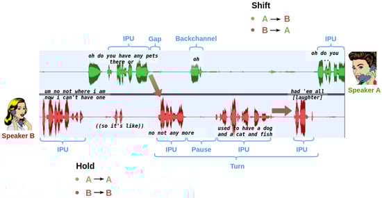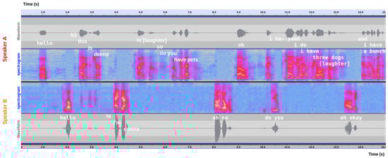 The following section explores notable turn-taking phenomena during the initial 15 s of a telephone call between two unfamiliar speakers https://catalog.ldc.upenn.edu/LDC2004S13 (accessed on 8 December 2025). In general, most conversations begin with a greeting phase that serves as a foundational exchange. This greeting phase typically comprises mutual salutations, self-introductions, and brief acknowledgements, which are examples of adjacency pairs [8]. Unlike written exchanges, where a user explicitly sends a complete message (e.g., pressing “enter”), spoken interactions allow participants to speak simultaneously or interrupt each other’s turns. Determining when a speaker has finished an utterance can therefore be far from trivial.