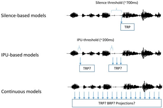 The practical implementation of turn-taking in computational models has largely overlooked the concept of predictive turn-taking. Traditionally, spoken conversational systems have been developed similarly to text-based exchanges, where responses are generated only after the preceding contribution is entirely made. In written dialogue, conversations proceed through complete messages exchanged sequentially, with participants responding only after fully receiving a message. This structured format explains why many spoken dialogue systems have traditionally used a silence-based policy to determine the end of a speaker’s turn by detecting silence exceeding a predefined threshold. This method is depicted in the upper part of Figure 4. Turn-taking models typically differ in how they identify Transition-Relevance Places (TRPs), or points at which speakers can appropriately exchange turns [8]. However, silence-based models are not well-suited to accurately predict TRPs, as silence alone does not always indicate turn completion. Natural conversation frequently contains pauses that are not necessarily turn-ending signals but can indicate hesitation, emphasis, or the planning of further speech. Consequently, silence-based models often misinterpret natural pauses as TRPs, leading to unnatural interruptions or overly delayed responses. IPU-based models improve upon this by analysing inter-pausal units (IPUs), which are short speech segments separated by brief silences, typically around 200 ms. These models classify each IPU boundary as either an actual TRP or a continuation of the current speaker’s turn, as shown in the middle row of Figure 4. Nevertheless, even IPU-based models remain limited by their reliance on predetermined heuristics to identify potential transition points, restricting their ability to predict future TRPs or suitable moments for backchannel responses. The most advanced turn-taking models are incremental or continuous models that actively analyse speech and silence in real time, independently identifying potential TRPs, as depicted at the bottom of Figure 4. By operating continuously, these models are capable of predicting upcoming TRPs even during ongoing speech, enabling smoother conversational transitions and timely backchanneling.