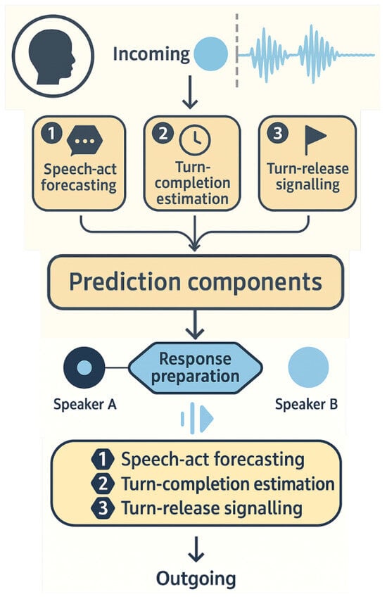 Syntactic and pragmatic completeness contribute to projectability, which refers to how listeners anticipate when an utterance will be completed. Ref. [8] argue that turn-taking relies on predictive mechanisms, where listeners estimate the completion of a turn rather than waiting for explicit signals at the end. This predictive ability explains how speakers often begin to respond within ms (200 ms) of a turn ending, even before the previous turn is fully completed [10]. Projectability also plays a role in collaborative speech behaviours, such as choral speech and sentence completions, where listeners actively participate in constructing an utterance [42]. For example, if a speaker says, “I would like to order a …”, the listener can predict that a noun (e.g., “coffee” or “sandwich”) will follow, allowing them to delay their response appropriately. Similarly, in question–answer exchanges, the syntactic structure of a question provides clues about when and how the listener should respond, making syntax a key factor in turn regulation.