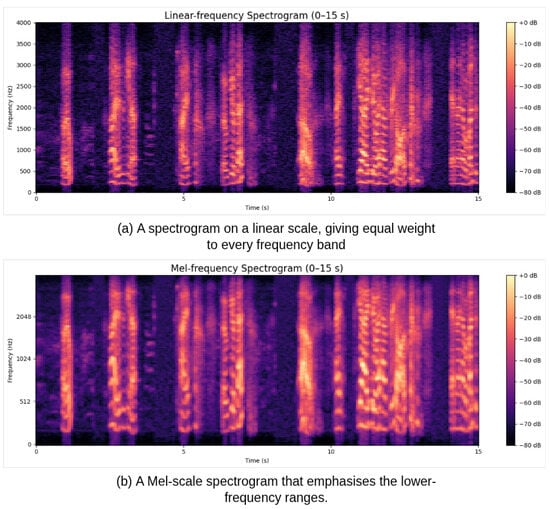 A spectrogram provides a two-dimensional visualisation of an audio signal, showing how energy is distributed across frequency (y-axis) over time (x-axis), as illustrated in Figure 7. It serves as a compact representation of both temporal and spectral information, making it a valuable basis for analysing acoustic cues relevant to turn-taking, such as pitch movement, intensity variation, and pauses. In practice, a spectrogram is computed by analysing short segments of the waveform to reveal frequency content over time, while a Mel-spectrogram further adjusts the frequency scale to approximate human auditory perception, emphasising the lower frequencies to which humans are most sensitive [81]. In this review, spectrograms are referenced only to contextualise acoustic feature representations used in turn-taking models, rather than to detail the underlying signal-processing procedures.