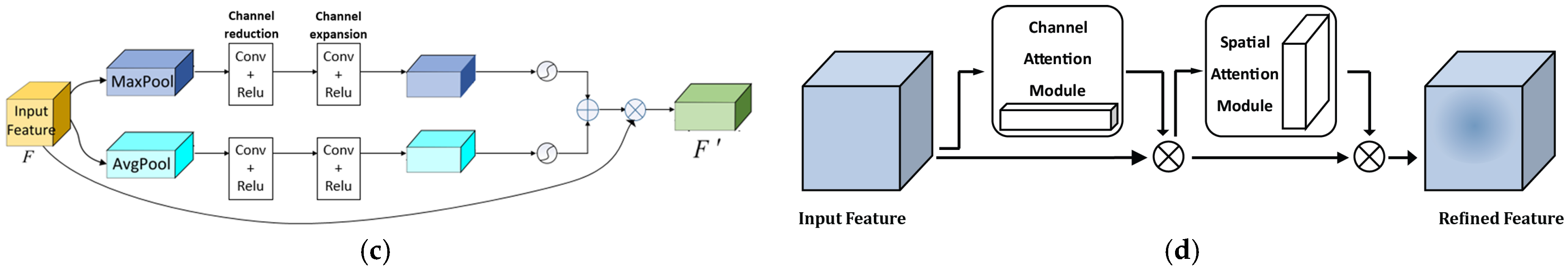 This sequential combination of channel and spatial attention allows CBAM to progressively enhance feature representations. Its plug-and-play nature, minimal computational overhead, and strong empirical performance have made it a widely used attention module in deep convolutional architectures. The full structure is depicted in