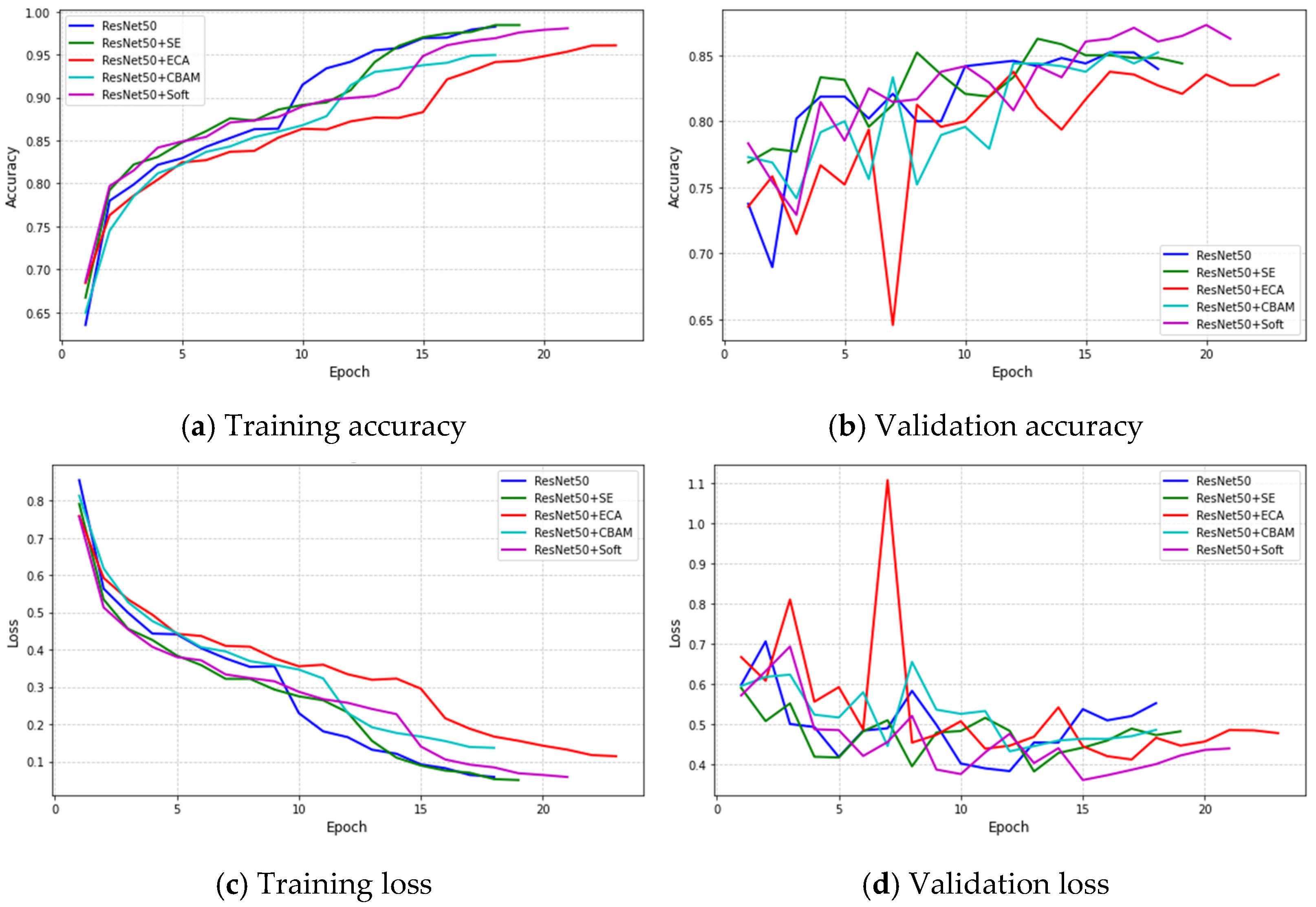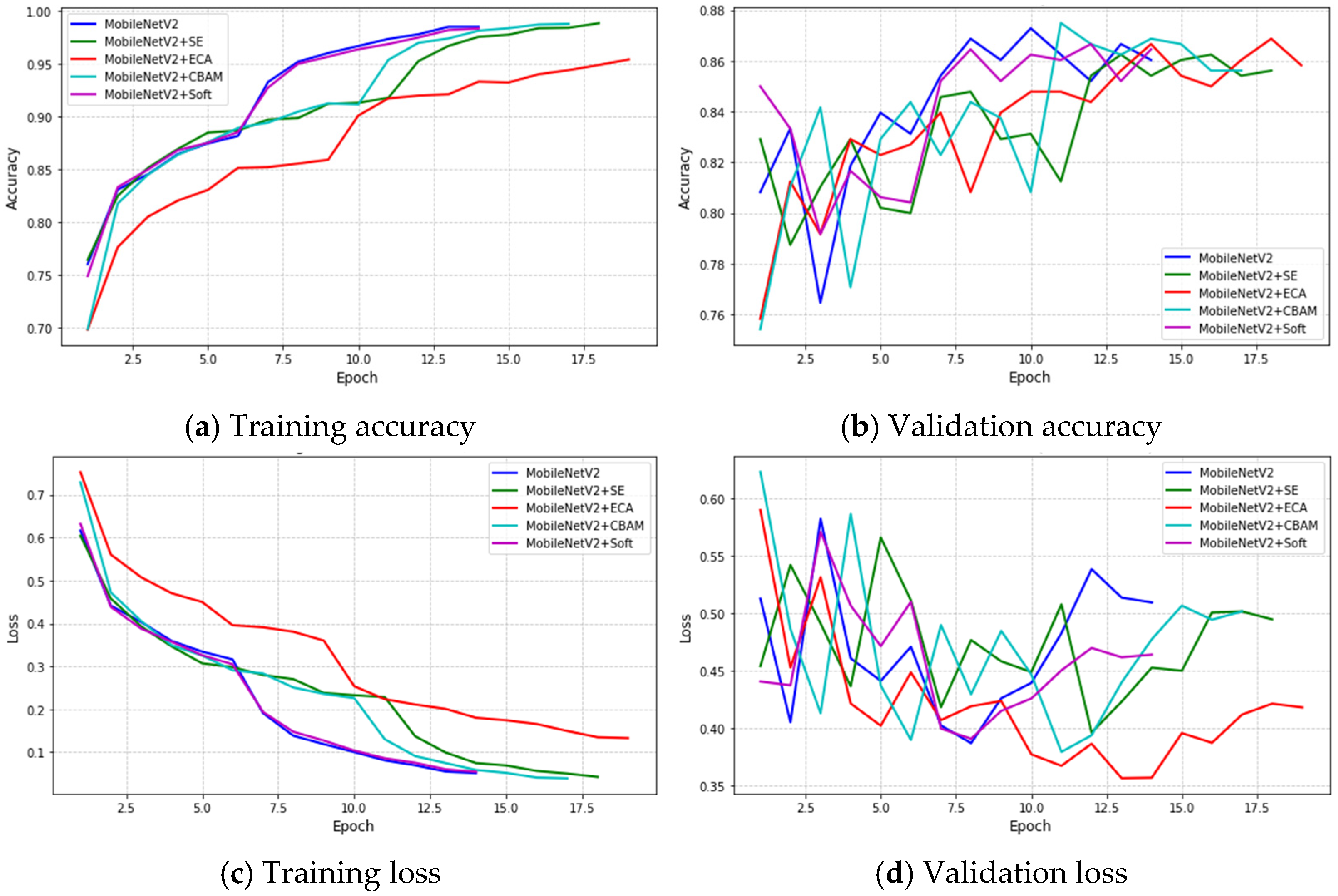 By comparing the parameters, model size, FLOPs, and mean epoch training time, it is clear that attention-augmented variants introduce only modest increases in model complexity relative to their baseline counterparts. For ResNet50, adding SE, ECA, Soft, or CBAM slightly increases parameters and model size, which is reflected in longer mean epoch times—from 117.76 s for the baseline to 128.23 s (SE), 133.72 s (ECA), 145.94 s (Soft), and 159.74 s (CBAM)—indicating that training overhead grows moderately with more sophisticated attention modules. MobileNetV2 variants exhibit a similar trend, with mean epoch times rising slightly from 52.82 s for the baseline to 55–61 s for attention-augmented models, while still maintaining the lightweight and efficient nature of the architecture. Overall, these results demonstrate that attention modules can enhance model performance while preserving computational efficiency, with training time increases remaining reasonable for both heavyweight and lightweight networks.