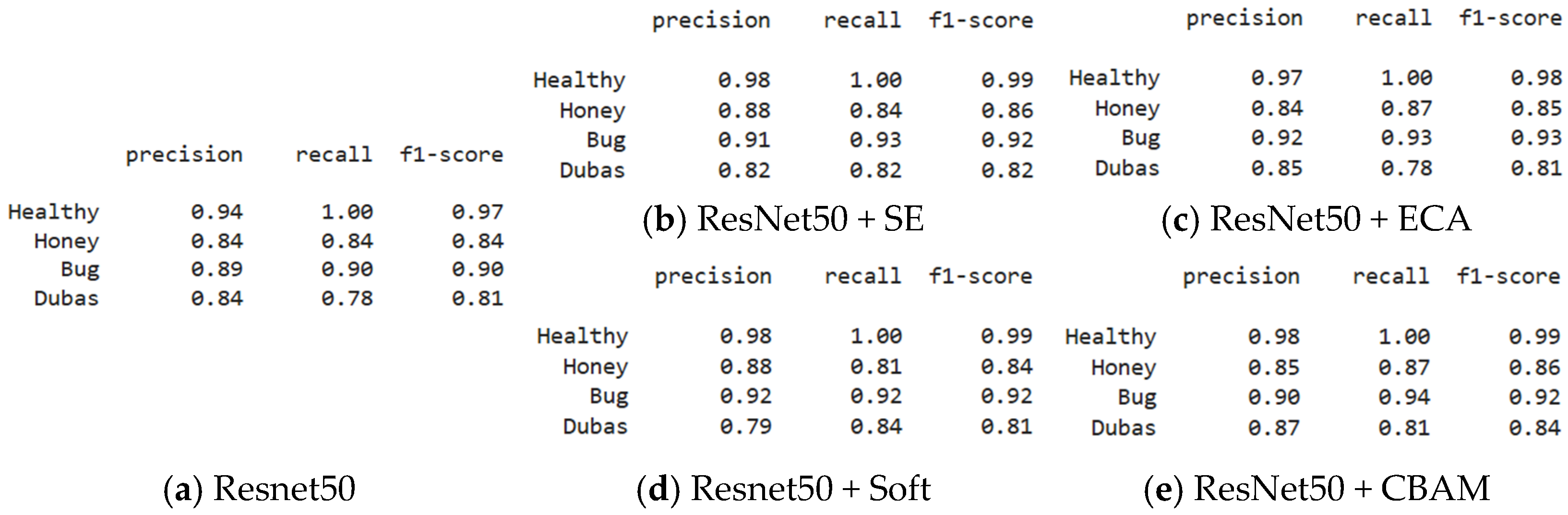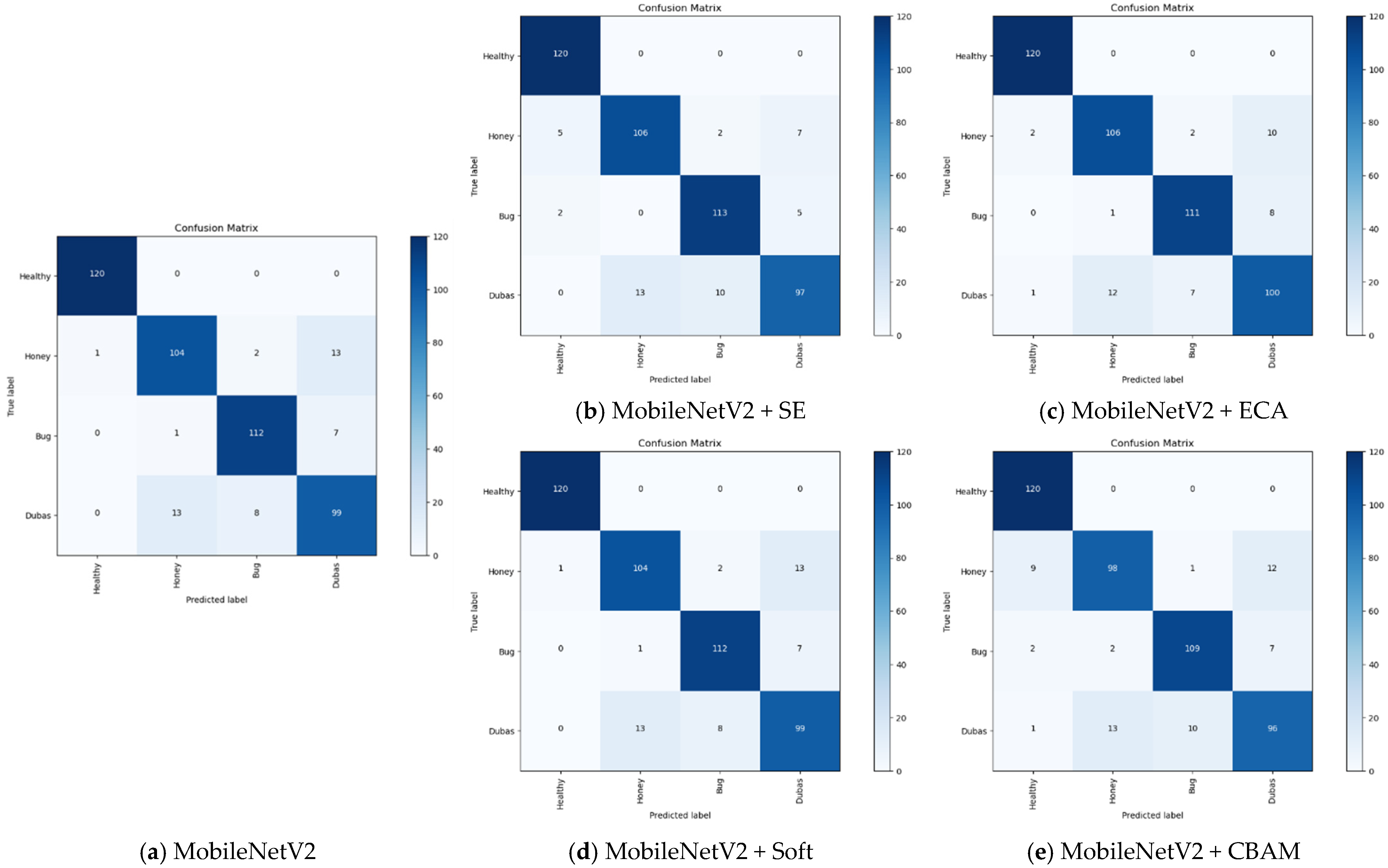 In the case of MobileNetV2, the baseline model already achieved high accuracy (90.2%), indicating strong performance even without attention. However, integrating attention modules further improved its predictive ability. The best results were observed with ECA and SE, both reaching an accuracy of 91.0%, followed closely by Soft Attention (91.0%). These mechanisms also enhanced the classification quality across all classes, notably maintaining or improving recall for Honey and Dubas. However, CBAM slightly reduced the overall accuracy to 88.1%, which could be attributed to its relatively complex structure, possibly introducing overfitting or architectural incompatibility in the lightweight MobileNetV2 framework. This result highlights the importance of selecting attention modules appropriate to the network’s design complexity and capacity.