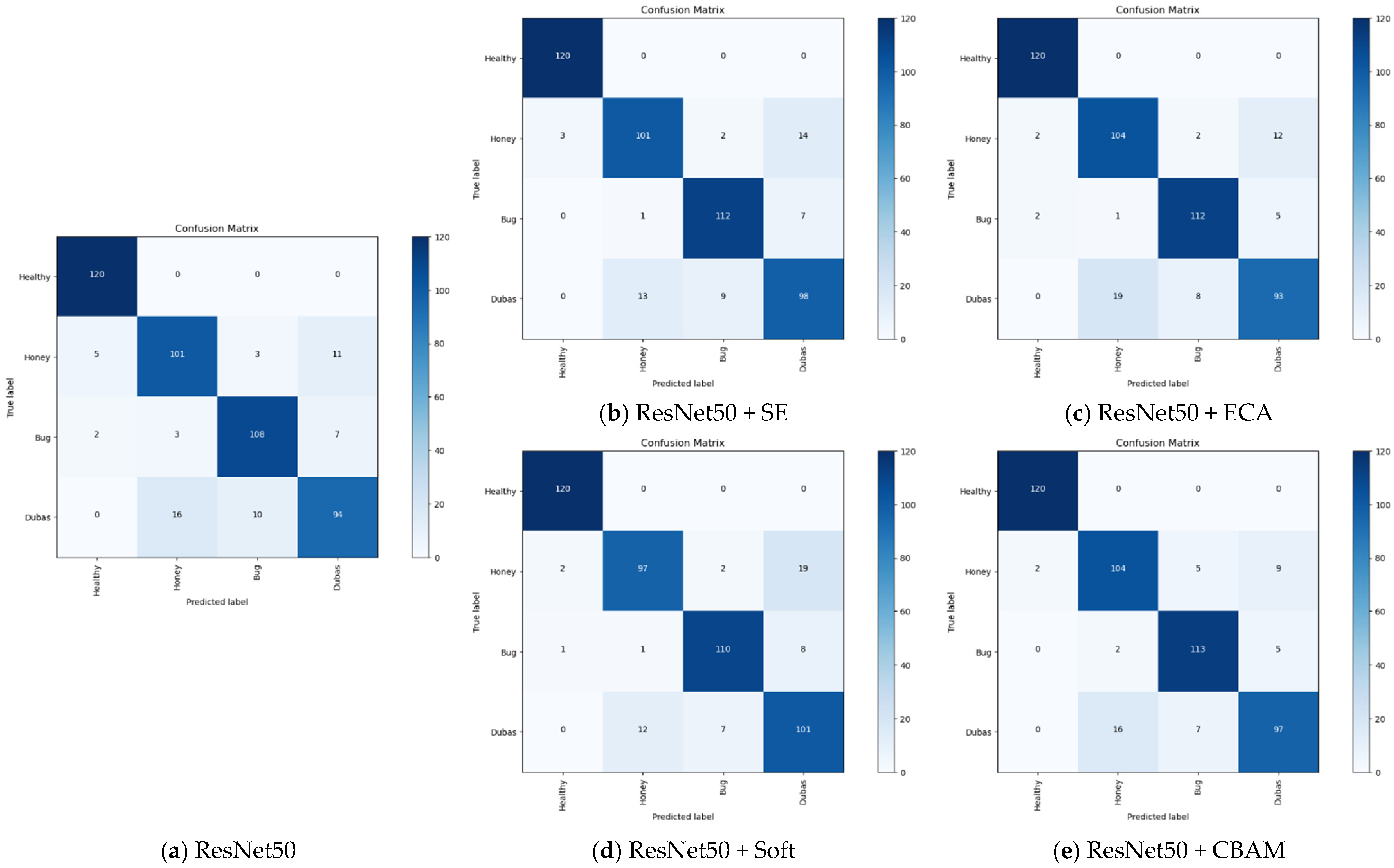 The baseline ResNet50 model achieved a test accuracy of 88.1%, with a particularly high F1-score for the Healthy class (0.97), but relatively lower scores for Honey (0.84) and Dubas (0.81), indicating that these classes are more difficult to classify correctly. The integration of attention modules led to noticeable improvements. Among the tested mechanisms, CBAM provided the highest performance, reaching an accuracy of 90.4%, followed closely by SE (89.8%), Soft Attention (89.2%), and ECA (89.4%). The attention-augmented models demonstrated consistent gains in per-class F1-scores in addition to global improvements. For example, the Dubas class, which exhibited weaker performance in the baseline model, reached an F1-score of 0.84 with CBAM and maintained or improved values in all other configurations. These results confirm that attention mechanisms help the model better capture subtle features, especially for visually similar or ambiguous pest classes.