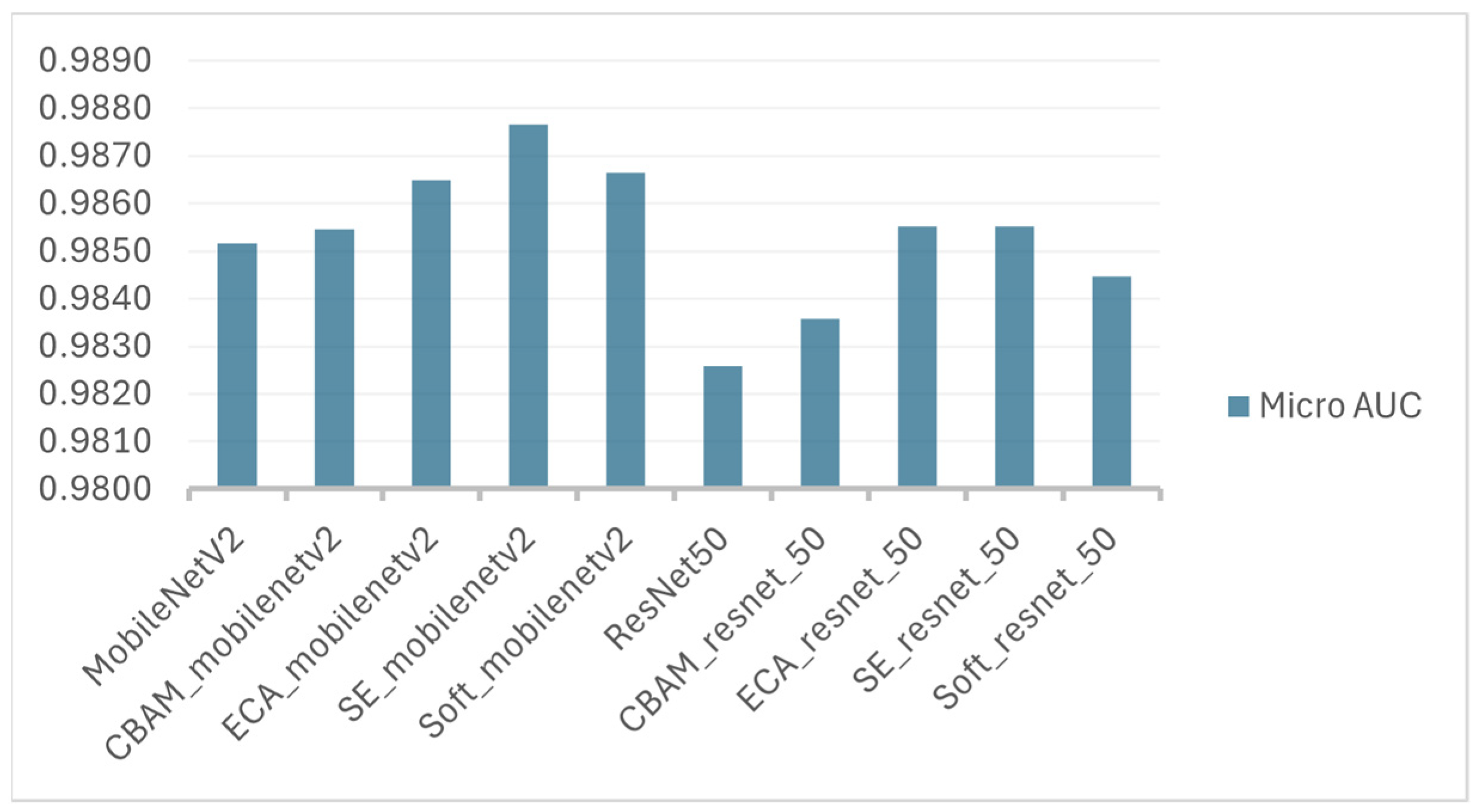 The micro-AUC analysis provides additional evidence on the global discriminative quality of the evaluated models. All architectures achieve high micro-AUC values (>0.98), indicating that the generated probability scores allow for clear separation between classes independently of the decision threshold. For ResNet50, the SE and ECA variants achieve the highest micro-AUC values, suggesting improved feature weighting and enhanced sensitivity to relevant spatial patterns. Similarly, MobileNetV2 benefits from the integration of SE and Soft Attention, which yields the strongest overall separability among lightweight models. Although the performance gains remain moderate (≈0.002–0.004), the consistently high micro-AUC across all networks suggests that the baseline architectures already exhibit strong discriminative power, with attention modules providing incremental but meaningful refinements. These findings are visually confirmed by the micro-AUC distribution shown in