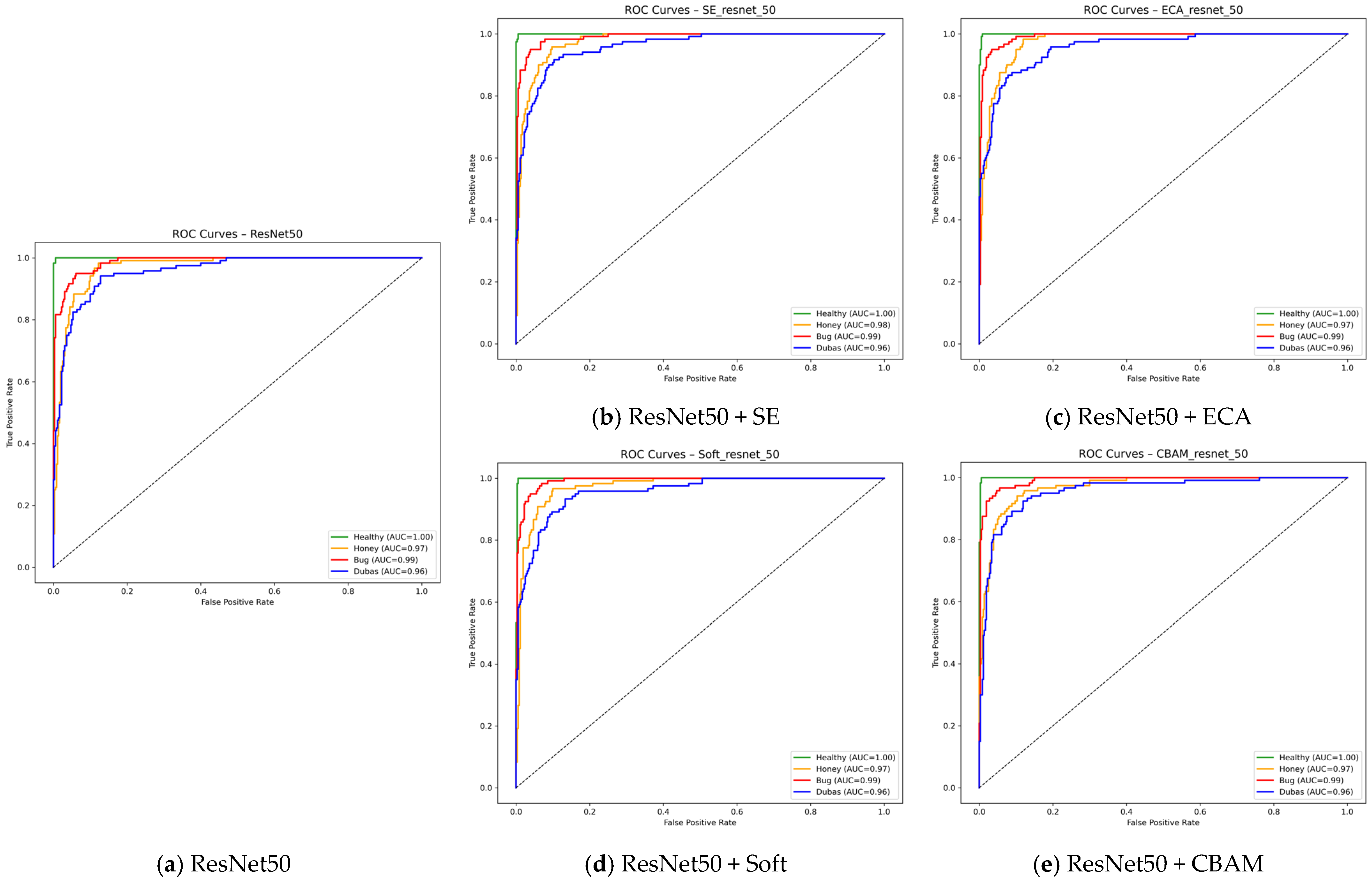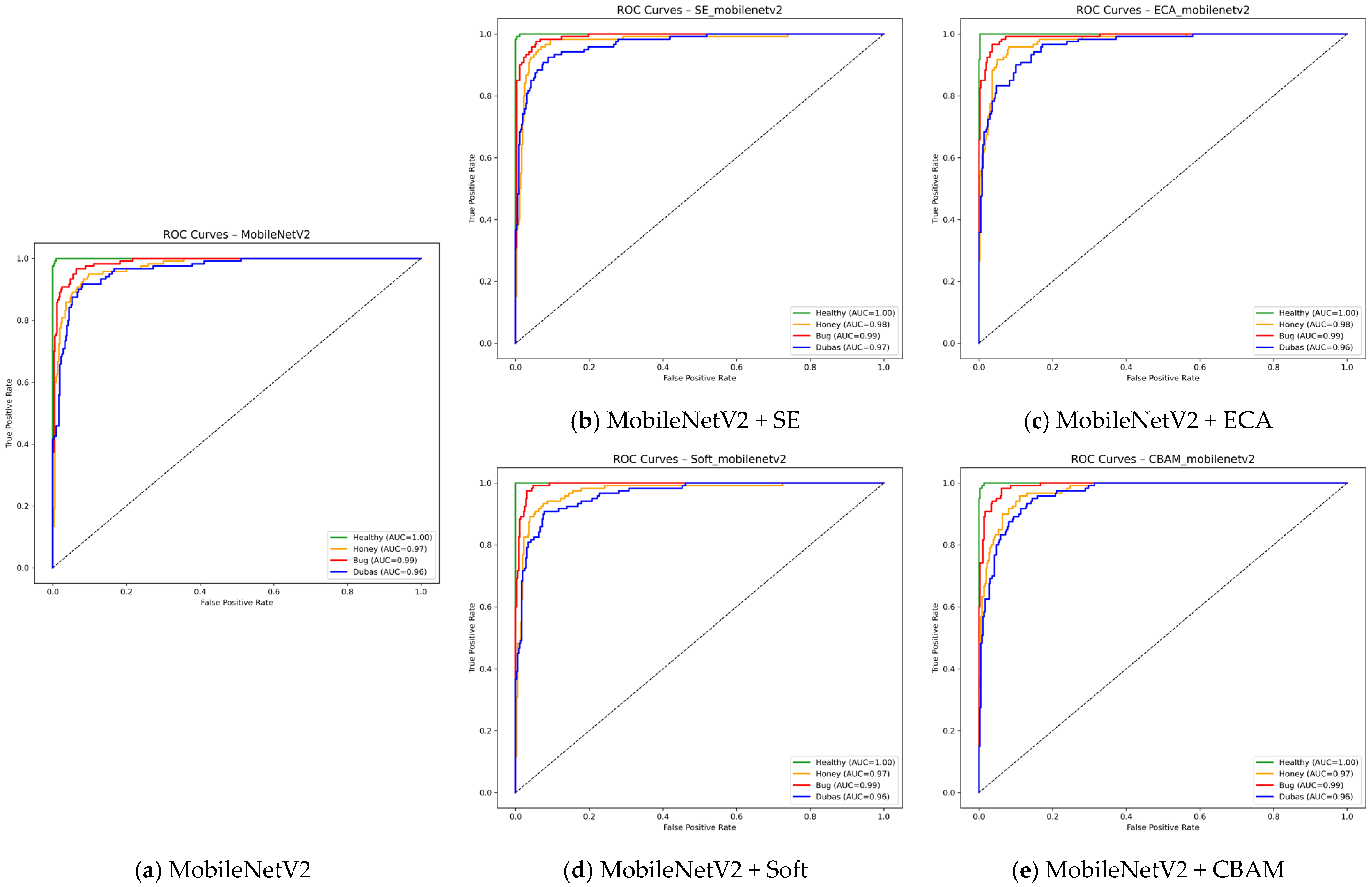 Figure 13 provide a complementary view of model discrimination and remain consistent with the overall trends previously observed. For both ResNet50 and MobileNetV2, all attention-augmented variants—SE, ECA, Soft Attention, and CBAM—tend to produce ROC curves that are smoother and shifted toward the ideal upper-left region compared to their respective baseline models. This indicates a generally improved ability to distinguish among classes, even if the relative gain varies across attention mechanisms. These ROC profiles confirm that integrating attention modules enhances the global discriminative behavior of the networks, reinforcing the conclusions drawn from the other performance analyses.