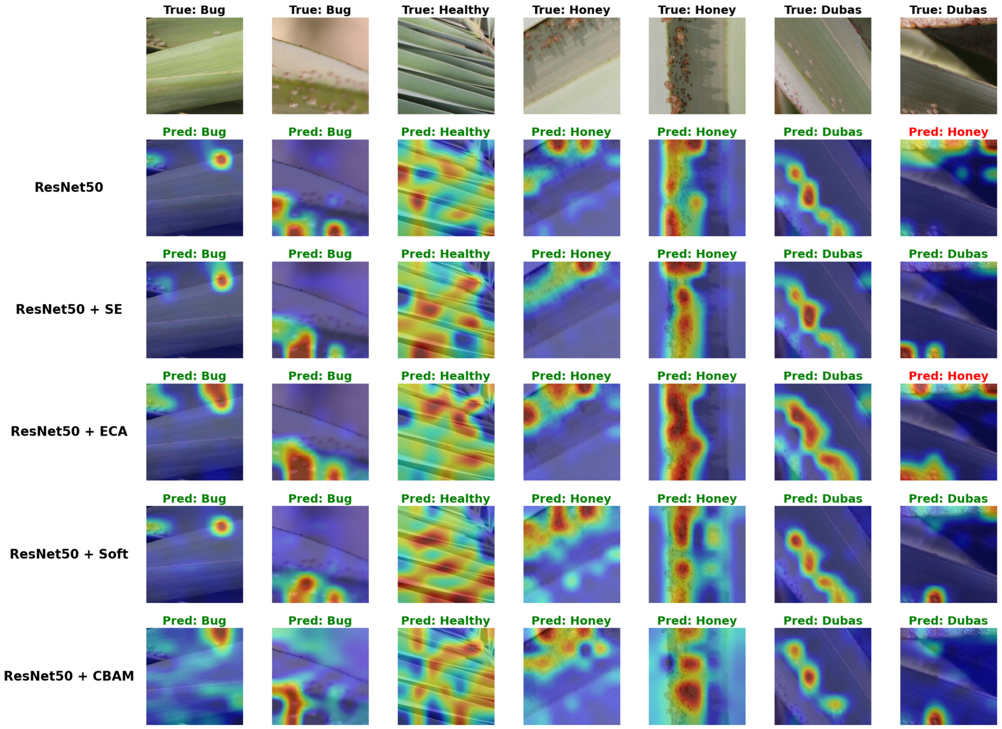 Figure 15, similar trends are observed. The base ResNet50 model generates heatmaps that generally align with the key regions of interest but often lack spatial precision. In certain cases, such as the last column (True: Dubas), the model misclassifies the sample as Honey, and the heatmap reveals attention spread across the leaf surface, missing the key disease indicators. The integration of attention mechanisms once again enhances the focus and interpretability of the model. SE produces the most well-localized attention maps for ResNet50. CBAM, although sometimes capturing relevant regions, generally generates more diffuse heatmaps and spreads attention across larger portions of the leaf.