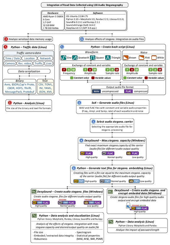 As seen from Figure 3, the research encompassed an assessment of the memory footprint of serialized road-condition data, the selection of an appropriate audio format for steganographic embedding, and an examination of the effects of steganographic processing on audio quality, embedding capacity, robustness, encryption characteristics, data structure, memory usage, and the speed of data integration and extraction.