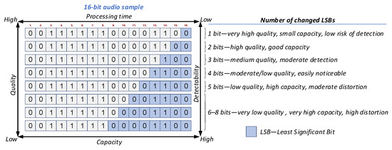 Increasing the number of modified LSBs expands the available embedding capacity but also increases perceptual distortion, processing time, and detectability of the hidden message, a well-known trade-off in audio steganography research [53]. In practice, the number of modified LSBs depends on the selected output quality: high-quality output modifies only a small fraction of LSBs, preserving audio fidelity, whereas low-quality output modifies a larger number of LSBs, increasing the available embedding capacity at the cost of greater distortion (Figure 4).