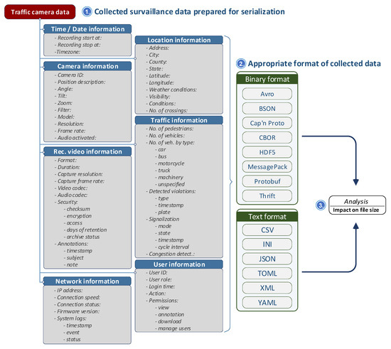 A modern surveillance system designed for visual inspection includes a network of cameras that continuously record activity on supervised traffic roads. The installed video surveillance equipment allows a real-time overview of the traffic situation. Today’s surveillance cameras are equipped with high-resolution sensors to capture fine details, which are necessary for recognizing specific objects or identifying the behavior of road users. Some camera systems include on-board data pre-processing, where filtering, segmentation, or object detection tasks can be performed. This is necessary to reduce network load and storage requirements on surveillance center servers for further data analysis. Furthermore, surveillance cameras generate a massive volume of data, so a secure and scalable storage solution and efficient compression algorithms are necessary. Compression algorithms and codecs help reduce file sizes while preserving visual information like faces, vehicle license plates, or other identifying features. In addition to storing video footage, surveillance systems are using computer vision and machine learning algorithms to transform recording into a source of information about the traffic road conditions, e.g., to detect unusual movement patterns, count vehicles or pedestrians, or automatically tag specific activities. Tagging procedures allow searching for videos according to multiple criteria, e.g., types of detected activity, not just the place and time in which they were recorded.
