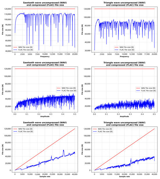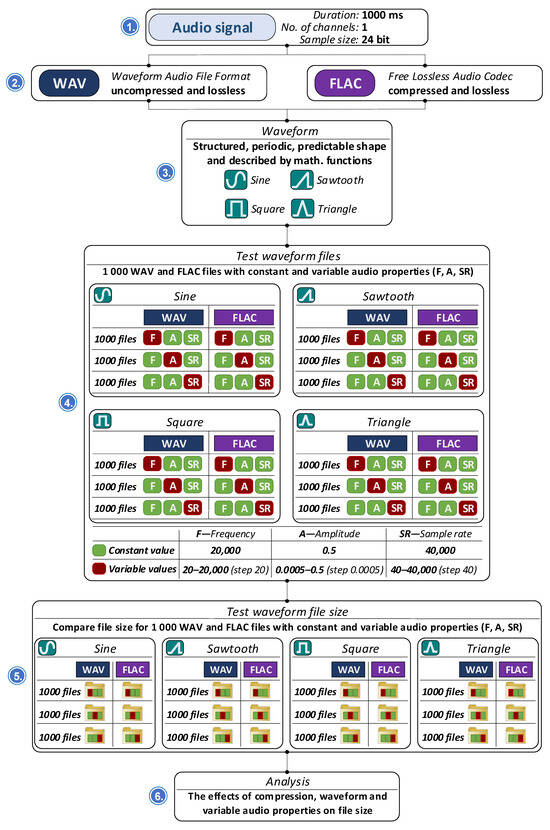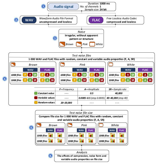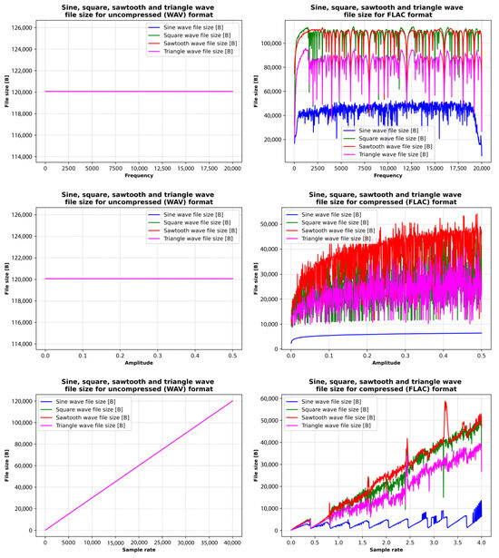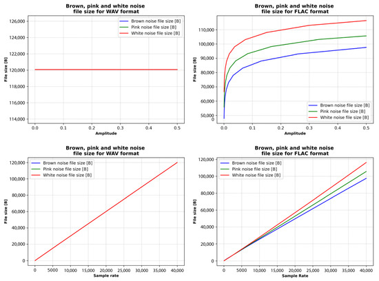 The initial phase of testing examined memory consumption associated with different frequently used data formats. Specifically, eight recordings were analyzed in binary format and six in textual format, with the primary objective of comparing memory usage between these two methods of data representation and storage. Subsequent tests shifted focus toward analyzing the memory footprint of the audio files themselves, which served as carriers of the steganographically integrated data. These tests explored how different parameters influence the final size of audio files, particularly in two widely used formats: WAV (uncompressed) [37] and FLAC (compressed) [38]. The influence of waveform type was assessed using standard signal forms, including sine, triangle, square, and sawtooth waveforms. In parallel, the impact of various noise types (namely, white, pink, and brown) on file size was investigated under identical format conditions. Further experimentation addressed the effects of steganographic embedding under a range of controlled conditions. One aspect of this analysis considered the scenario in which the full steganographic capacity of an audio file was utilized, while maintaining a defined level of audio quality.