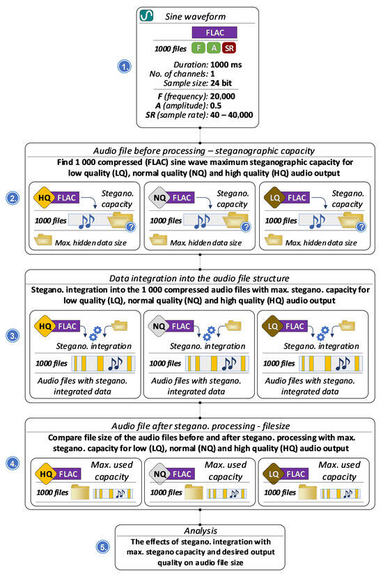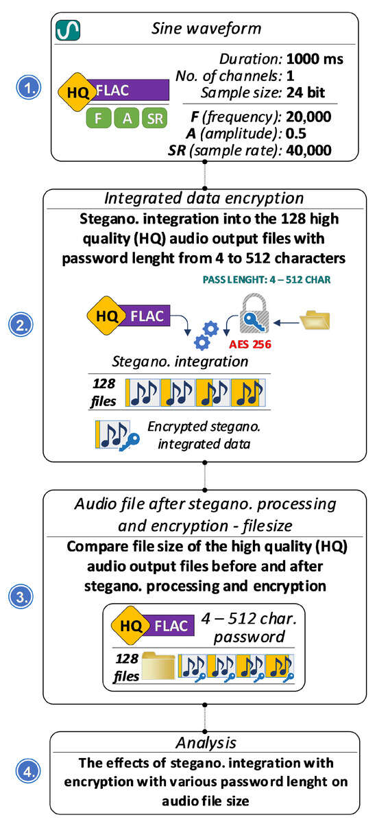 To evaluate the effectiveness of the steganographic integration system within audio recordings, a comprehensive series of tests was conducted, focusing on various aspects of data storage, audio processing, and compression behavior. Figure 3 summarizes the experiment workflow, with added information about the hardware and software used.
