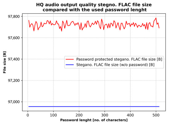 The DeepSound application employs AES-256 encryption [48] to protect the embedded steganographic payload, providing a widely accepted and highly secure standard for safeguarding sensitive data. In this study, the effect of password length on the memory footprint of the stego-processed files was also examined (see Section 4.5). The results show that password length has no measurable impact on the final file size, indicating that encryption overhead does not influence the storage characteristics of the generated stego-audio files.