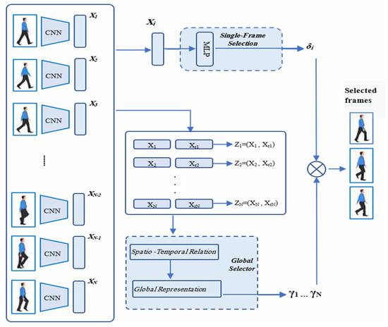 The smart frame selection mechanism, inspired by the method proposed in [38], assesses both the individual and relational importance of video frames. This method consists of two key components: a single-frame selector and a global selector. The single-frame selector examines the information of each frame independently and assigns a score δi to indicate the usefulness of the frame for classification. Concurrently, the global selector considers the entire video sequence to capture relationships between frames using an attention and relation network. This network takes pairs of frames as input, represented as concatenated feature vectors, and outputs scores γi, reflecting the importance of the temporal relationship between these frames.