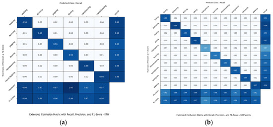 Performance in action recognition is often evaluated on benchmark datasets such as KTH, UCF Sports, and HMDB51. These datasets provide a diverse range of human activities, from simple actions (e.g., walking and clapping in KTH) to complex sports activities (e.g., in UCF Sports) and varied real-world actions (HMDB51). Ref. [43] demonstrated high accuracy on these datasets using 3D CNNs combined with attention mechanisms, highlighting the strength of deep learning approaches for complex video analysis [44]. However, the high computational cost of these methods underscores the need for more efficient architectures, like the one proposed in this paper.