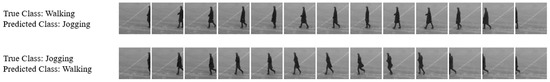 The KTH dataset consists of six types of human actions, including running, jogging, walking, hand waving, hand clapping, and boxing [17]. A total of 600 video sequences are performed by 25 actors, sampled at 25 frames per second (fps), with an original resolution of 160 × 120 pixels. These videos are recorded in four different scenarios: S1 (outdoors), S2 (outdoors with variations in image scale), S3 (outdoors with different clothing), and S4 (indoors). To reduce computational complexity, the resolution of all images was downscaled to 64 × 64 pixels.