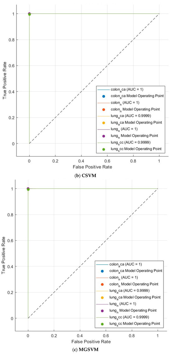 In contrast to these metrics, ROC curves are also illustrated in Figure 4 for QSVM, CSVM, and MGSVM, which attained the highest performance. This curve is generated by graphing the true positive rate in relation to the false positive rate. For effective classification, it is preferable for the Area Under the Curve (AUC) to approach 1 [56]. Figure 4 illustrates that the AUC value is determined to be 1 for all curves. The findings indicate that the suggested CAD offers a cost-effective, impartial, and considerably precise identification of LC cancer.