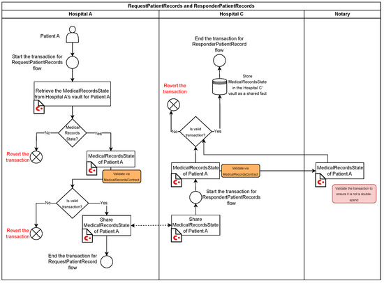These flows facilitate the secure sharing of medical records between two nodes, such as Hospital A and Hospital C. The process is split into two flows:
