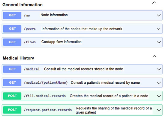 Figure 6, where it can be seen that three APIs refer to queries (GET) of general information of the nodes and four APIs refer to the medical history within which the query APIs (GET) and the APIs of publication and requisition (POST) of medical records are shown.