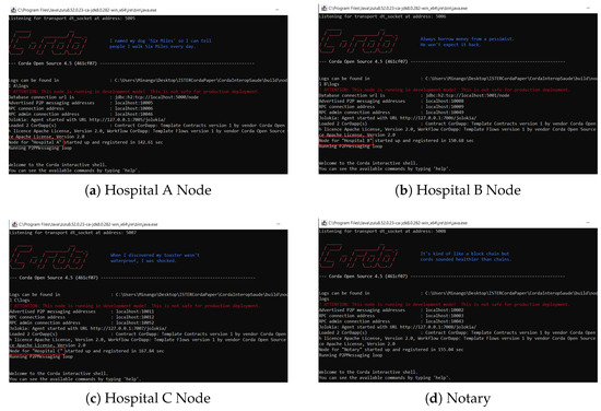 Figure 7, four terminal windows corresponding to the nodes of Hospital A, Hospital B, Hospital C, and the notary are shown. These terminals run on a Java Virtual Machine (JVM), as Corda is built on the JVM, which it uses to execute code and manage the runtime environment. Additionally, the name assigned to each node in the Corda network is highlighted within the red box of each terminal.