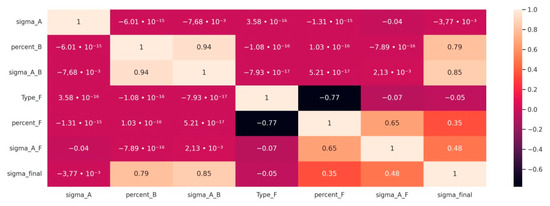 For different combinations of parameters, the correlations between the target variables and factors are calculated according to Equation (1); that is, for pairs of factors and target variables, the sums of all the values (which are different for each combination of parameters), the arithmetic means, the products, the standard deviations, etc. are calculated. All of this was performed for a sample consisting of 240 records—data from actual laboratory experiments. Despite the strong linear dependence between some factors and the target variable (rsigma_A_B/sigma_final = 0.9, rpercent_B/sigma_final = 0.8, and rsigma_A_F/sigma_final = 0.5), there is a nonlinear nature of the relationship between the strength data from the factors we described; that is, the values of the Pearson pair correlation coefficients do not fully reveal the relationships between the data. Therefore, a study of the feature space and its impact on the target result was carried out in accordance with the entropy approach of the information gain, which allowed us to obtain slightly different results. The nonlinear structure of the data is confirmed further in this study: The linear regression model has less reliability compared to those of machine-learning methods.