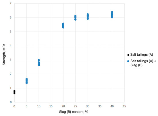 The compressive strength of the samples made solely from salt tailings was 0.72 MPa. The binder (blast furnace slag) increased the strength to 1.5 MPa at a slag content of 5% and to 6.0 MPa at a slag content of 25%. Further increases in the slag content beyond 25% had from little to no effect on strength improvement (Figure 4).
