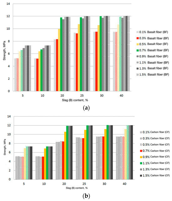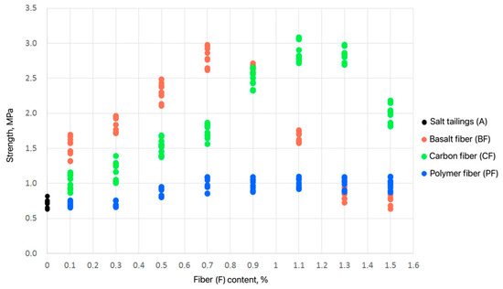 In addition to the binder, a reinforcing component, fiber, was added to the backfill to enhance the strength characteristics of the material. Fiber is a material used primarily in construction to strengthen and improve the properties of concrete (e.g., reducing shrinkage, preventing cracking, and increasing durability) [71,72,73]. Because of these properties, fibers are often referred to as “micro-reinforcements” and are considered as an alternative to traditional reinforcement methods [74,75,76]. There are several types of fibers: metallic, glass, polymer, basalt, and carbon. The drawbacks of metallic and glass fibers include their susceptibility to corrosion in cement hydration environments, and metallic fibers cannot be used in the presence of chloride salts.