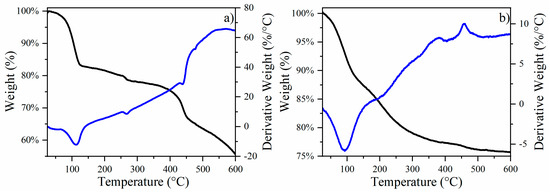 Thermogravimetric (black line) and differential thermal analysis (blue line) of (a) CuFe-prec sample and (b) CuFe/Al2O3-prec sample.