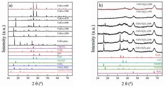 X-ray Diffraction of (a) CuFe-prec and CuFe-cT samples and (b) CuFe/Al2O3-prec and CuFe/Al2O3-cT samples in oxidizing environment (T = 200 to 600 °C).