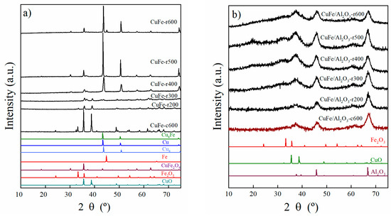 In the case of the supported sample (Figure 4b), CuFe/Al2O3-c600, only the diffraction peaks arising from the material support are noticeable.