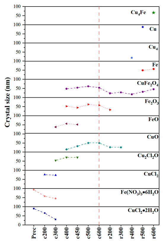 In addition, to better understand the formation of CuFe bulk during calcination and reduction, we have used XRD analysis to calculate the average crystallite size and its temperature-dependent changes using the Scherrer Equation (3), where D is the crystallite size (Å), λ is the wavelength (1.5418 Å), Scherrer’s constant K (0.9) is for good approximation [29], and β is the full width at half maximum (FWHM). The potential influence of error propagation and other factors that could contribute to peak broadening, such as variations in particle composition, was not considered in the determination of FWHM. The measurement was performed on the peak with the highest intensity within each phase. That is: Fe(NO3)3·6H2O, 22.3°; CuCl2·2H2O, 16.2°; CuCl2, 15.5°; Cu2Cl2O, 17.6°; CuO, 38.7°; FeO, 41.7°; Fe2O3, 33.2°; Fe, 44.8°; CuFe2O4, 62.7°; Cu4, 43.6 °: Cu, 43.3°; Cu4Fe, 43.2°.