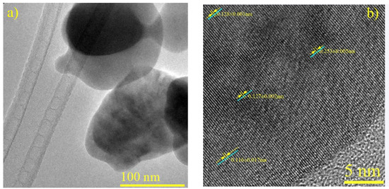 Characterization of CuFe-r600. (a) HRTEM Micrograph. (b) HRTEM micrograph with labeled interplanar distances.
