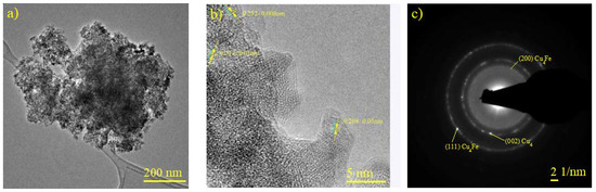 Characterization of CuFe/Al2O3-r600. (a,b) HREM micrograph, (c) SAED pattern obtained from the zone shown in (b).
