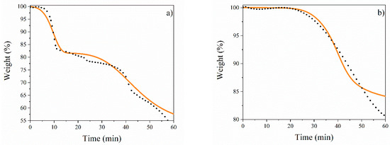 TGA fitting: (a) CuFe-prec oxidation, (b) CuFe-c600 reduction. Black dots represent experimental data, and a continuous line represents fitting of reaction rate net equation data at temperature rate of 10 °C/min.