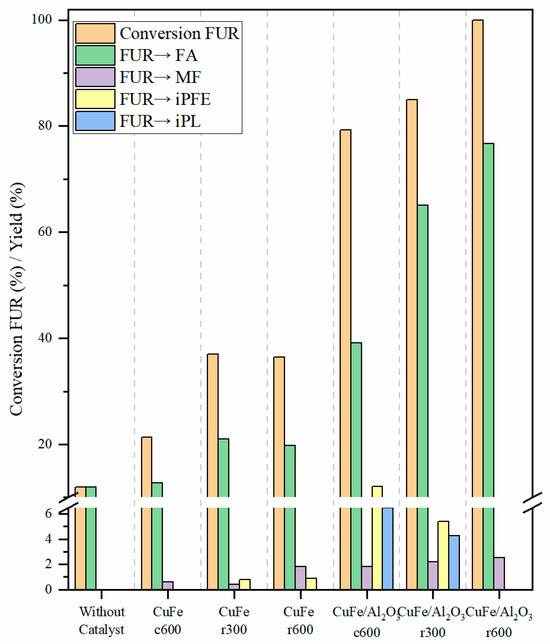 Conversions and yields in the hydrogenation of furfural for CuFe-c600, CuFe-r300, CuFe-r600, CuFe/Al2O3-c600, CuFe/Al2O3-r300, and CuFe/Al2O3-r600 at conditions of reaction: 100 mg of catalyst, 1.0 mmol for furfural 170 °C, 4 MPa of H2 and 6 h.