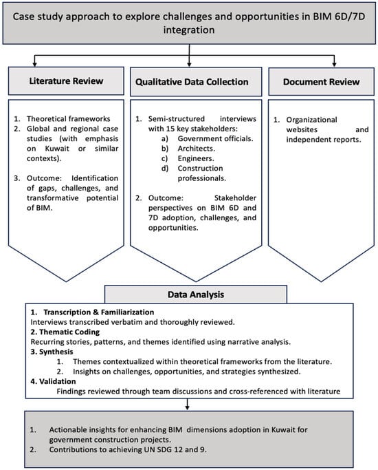 This study employed a qualitative approach to investigate the integration of BIM 6D (sustainability) and 7D (facilities management) into the Kuwaiti construction sector, with a focus on sustainable waste management and lifecycle optimization. Expert insights were gathered through a series of in-depth interviews with document analysis. The methodological steps are outlined in Figure 1.