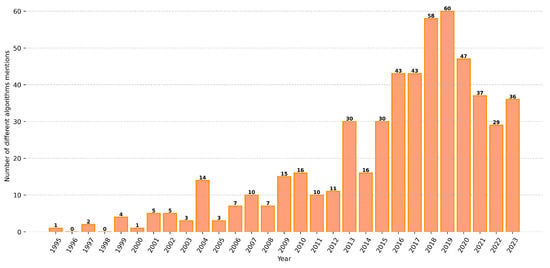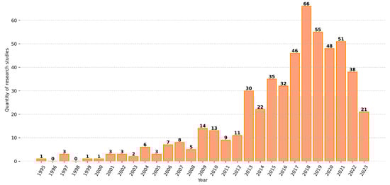 The selection criteria specified the inclusion of studies since the year 2015, whereas the search for specific research studies encompassed a broader timeframe, commencing from the year 1995 up to the year 2023. Articles from 2024 are not considered due to the specific topics defined for the search criteria. Figure 1 illustrates the distribution of the 534 works identified over the entire period under review. There has been a marked increase in studies since 1995, with a rising trend continuing until 2018. Following this peak, a decline in the number of studies is observed in the subsequent years.