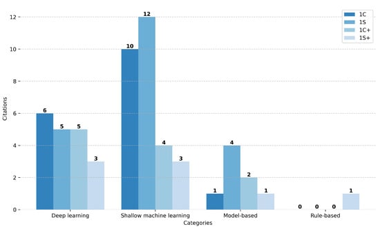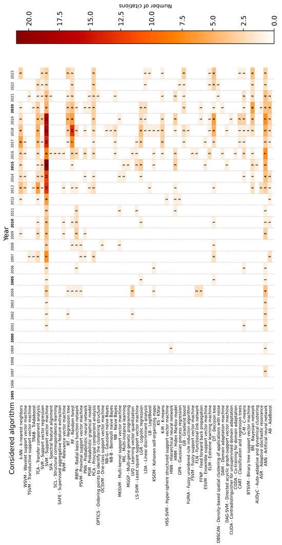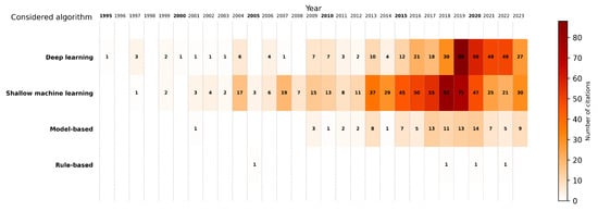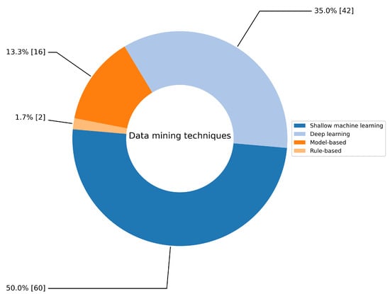 The summary of mentions of these maintenance strategies in the research studies is as follows: preventive maintenance with 22 mentions [,,,,,,,,,,,,,,,,,,,,,], condition-based maintenance with 16 mentions [,,,,,,,,,,,,,,,], and predictive maintenance with 105 mentions [,,,,,,,,,,,,,,,,,,,,,,,,,,,,,,,,,,,,,,,,,,,,,,,,,,,,,,,,,,,,,,,,,,,,,,,,,,,,,,,,,,,,,,,,,,,,,,,,,,,,,,,]. Corrective maintenance is infrequently mentioned in the literature concerning the application of data mining in industrial maintenance, with only 6 references [,,,,,]. Typically, these mentions serve to provide an introductory definition and to highlight its disadvantages in comparison to other maintenance models.