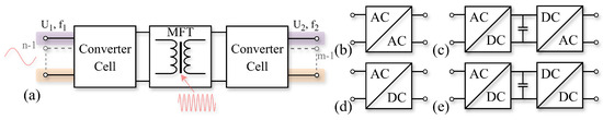 The fundamental SST structure shown in Figure 1a consists of an MFT with power electronic input and output converter cell stages. One of the goals of this study is to identify the possible configurations of the converter cell blocks. The most commonly used converter cell configurations are depicted in Figure 1b–e. These cells can function as AC/AC or AC/DC converters realized in one or multiple conversion stages with varying converter topologies, structures, and port numbers. Here, U1 and U2 represent the input and output voltages, respectively, f1 and f2 represent their frequencies, and n and m are the number of phases at the input and output, respectively.