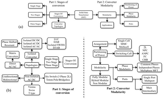 The proposed division of information in our two-part review of Solid State Transformers, covering Stages of Conversion and Converter Modularity, presented as follows: (a) a general overview of the main topics of each review and (b) a breakdown of the subjects for discussion and criteria for classification Parts 1 and 2.